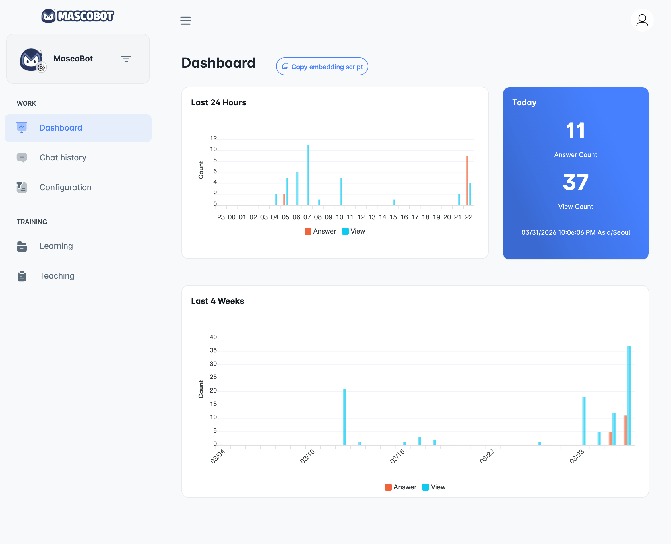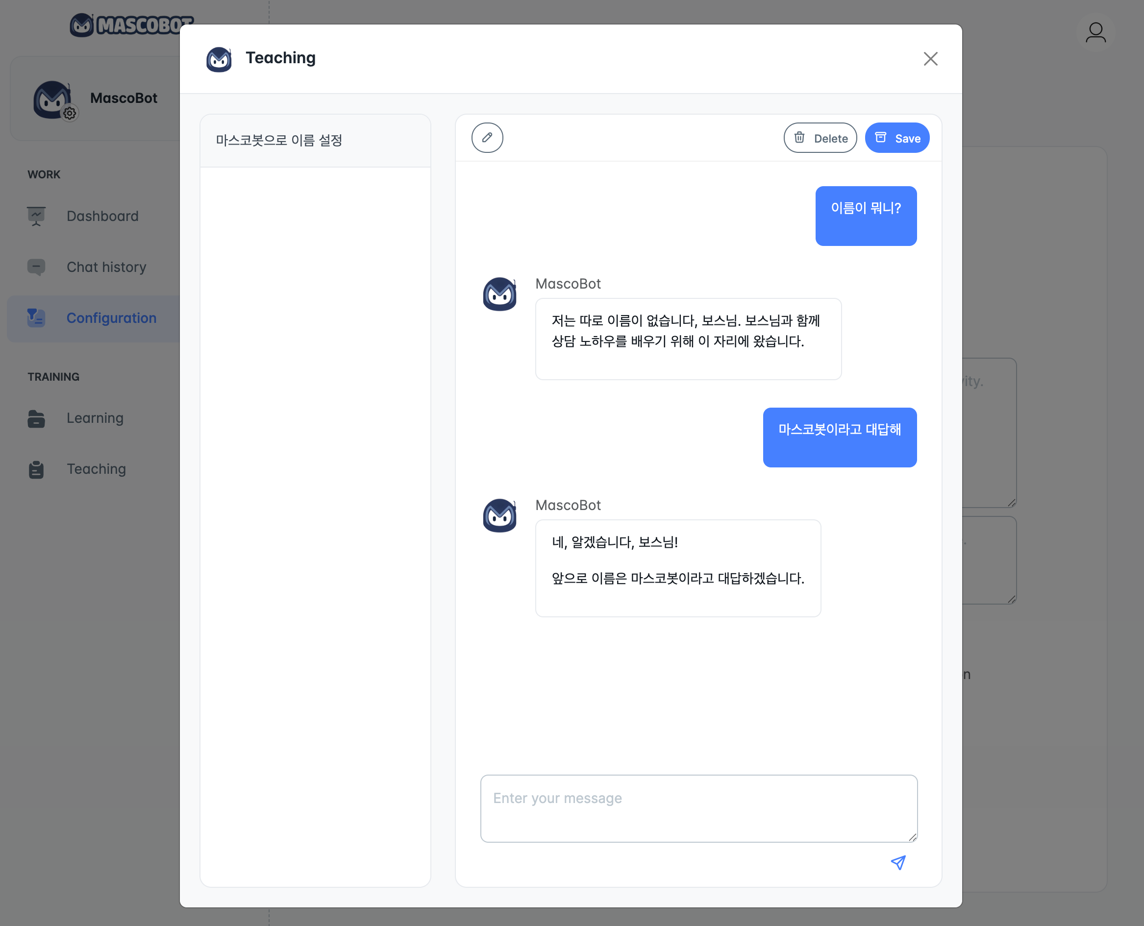 Set your AI mascot's name, personality, and tone, and train it with documents. You can also train it naturally through conversation.